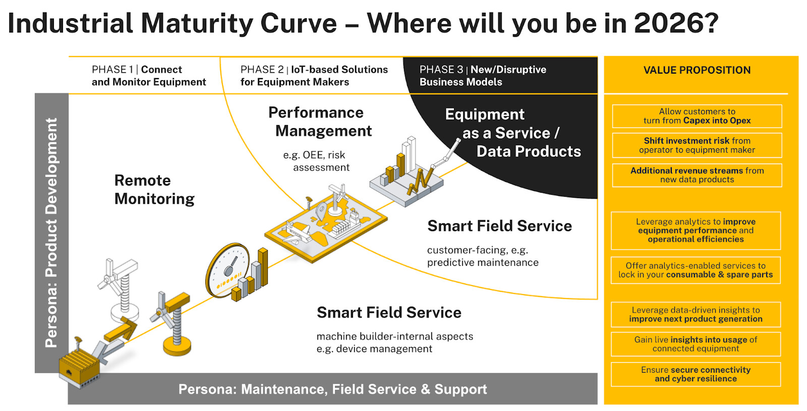 Usage-based billing, remote monitoring and predictive maintenance require reliable measurement and data flows. Industrial IoT platforms like Cumulocity connect machines worldwide, capture usage data in real time and make it available for billing, dashboards and service processes. This makes utilization, energy consumption and OEE transparent; alarms, tickets and workflows ensure that disruptions are addressed quickly; anomaly detection enables early identification of irregularities and helps avoid downtime. The same data foundation also forms the basis for continuous optimizations, from adjusting parameters to software upgrades.